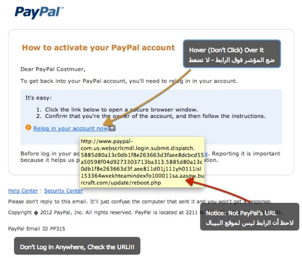– اذا وصلك رابط على الايميل فضع مؤشر الفأرة عليه وانظر تحت في المتصفح وتأكد من صحة الرابط.