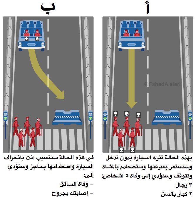 ٦٠٪ من المشاركين بالتصويت السابق اختاروا الخيار ب لانهم قرروا تقليل الخسائر (موت شخص واحد بدل ٥ اشخاص) وهذي هي نظرية النفعية Utilitarianism، وهي ببساطة نظرية اخلاقية تقول ان التصرف الصحيح هو الذي يحقق اعلى منفعة. هذا النوع من الاسئلة مأخوذ من معضلة شهيرة اسمها معضلة العربة Trolley Problem معضلة تنطبق على عدة امور بالحياة (سيارة، قطار، مستشفى، حرب،…). القرار في بعض الحالات التي تواجه الانسان يحتاج معيار اخلاقي نابع من تقدير شخصي (دين، مذهب، تعليم، عادات، تقاليد، تربية، تفضيل شخصي، عاطفة،..). وهنا احد التعليقات على التصويت